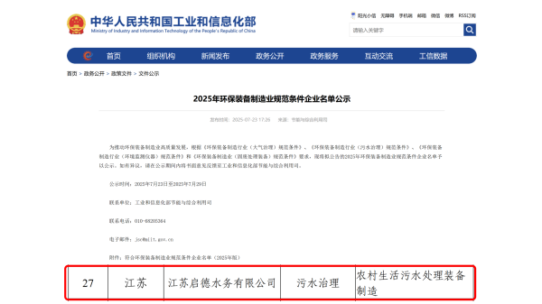 江苏启德水务有限公司获评工信部环保装备制造业规范条件企业