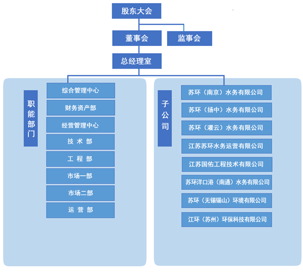 根据职能划分,环保产业公司设置八个生产经营及职能管理部门:综合管理中心、财务资产部、经营管理中心、市场一部、市场二部、技术部、工程部、运营部;下辖二个全资子公司、六个项目公司:江苏国佑工程技术有限公司、江苏苏环水务运营有限公司,苏环(南京)水务有限公司、苏环(扬中)水务有限公司、苏环(灌云)水务有限公司、苏环洋口港(南通)水务有限公司、苏环(无锡锡山)环境有限公司、江环(苏州)环保科技有限公司。